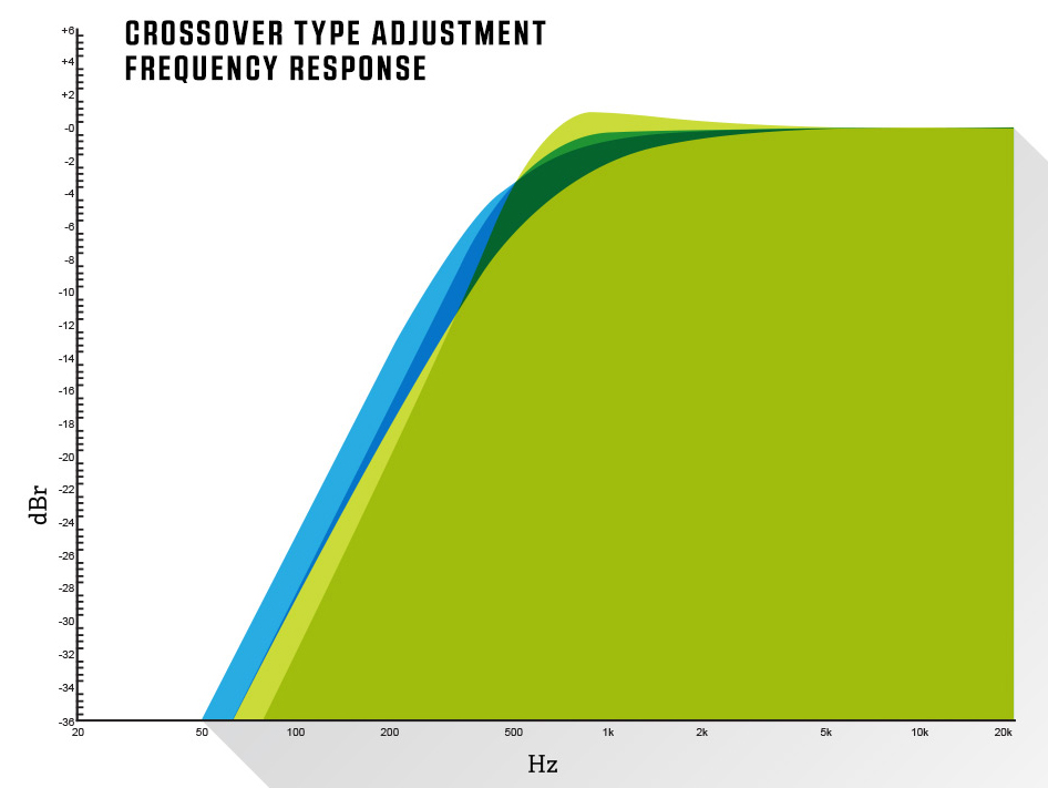 Tam aralık ayarına ek olarak, oktav başına -6 dB’den oktav başına -42 dB’ye kadar – 6 dB’lik artışlarla yedi kullanılabilir geçiş eğimi vardır.